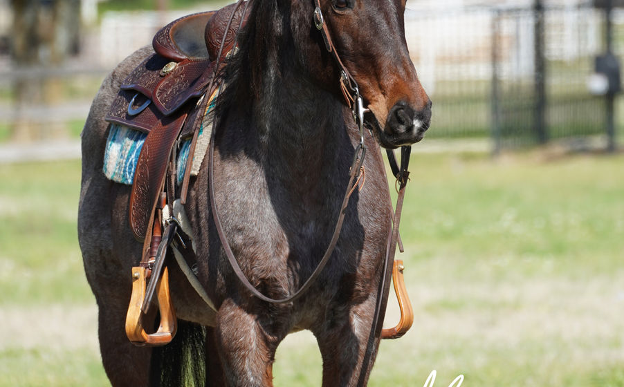 Looking for a super fun, SAFE, and colored kid horse?! “Josie” is a darling 2009, 15H, Grade QH mare that has so much to offer in a fun bay roan package! She has lived on a ranch most her life and has been used by a 69-year-old man to check cattle, inspect fence lines, and babysit his grandkids. If you are looking for a babysitter, jungle gym, fun, SAFE, and sweet mare to join your family – here she is. Kids crawl all over, under, and around her while shooting nerf guns, doing cartwheels, and running amuck! Josie has been to town, rides in parades, trail rides, and is happy to do any task you have in mind. Seasoned and quiet around cattle, traffic, balloons, tarps, flags, tractors, 4 wheelers, etc! She is used to the kids running out to the pasture with their halter/leadropes, and riding her up to the house bareback. Josie is tolerant and patient with the kids that bounce around in the saddle & have busy hands. She picks up both her leads in the arena, stops, backs, and has a good neck rein. Josie loves to trail ride; she is confident, brave, and willing to go through the pond, over bridges, steps right over logs, and down between gullies. Josie is very sweet and will stand tied for hours being groomed and doted on. She loads onto any trailer, is good for the farrier/vet, can be turned out with others, and has no vices. She is one of those that can go months without being ridden, and ride up gentle the next day. She has never offered to buck, rear, bolt, kick, etc. She rides in a Jr cowhorse bit, dog bone Dutton medium bit, or a snaffle! Current coggins, feet just trimmed, recent dental float this month. Josie has super clean legs, no injuries or soundness issues. She currently lives out with other mares/geldings and is a pleasure to be around. Take her out for a joyous trail ride, or let her babysit the kids in the arena/pasture -any family would love to have this gal – she is a doll. Josie is located in Terrell, TX. Shipping nation-wide can be arranged.